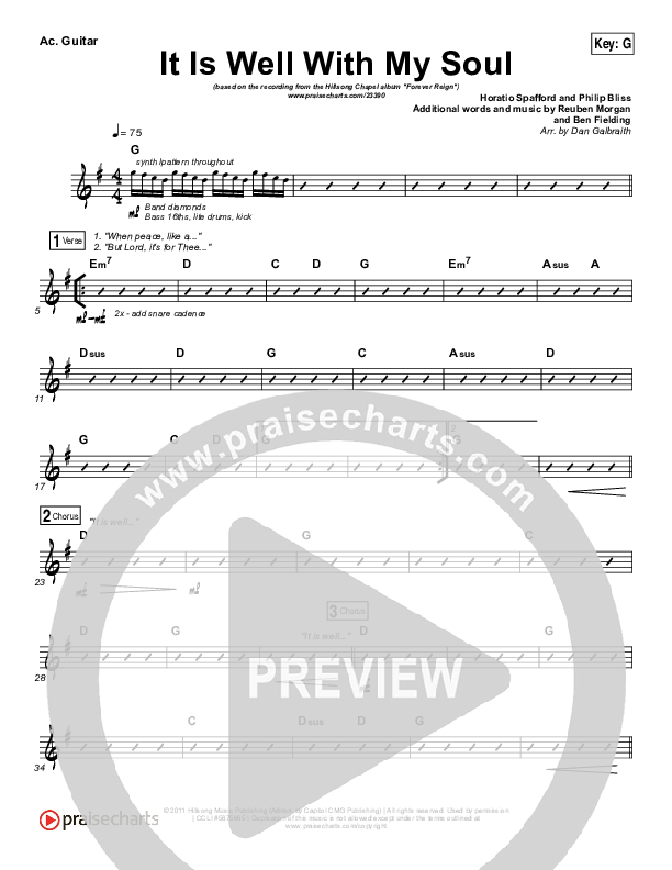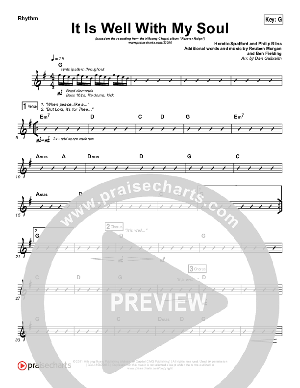 Download the Rhythm Chart for It Is Well With My Soul by Hillsong Worship / Hannah Hobbs, from the album Forever Reign. This song was arranged by Daniel Galbraith in the key of A, G.