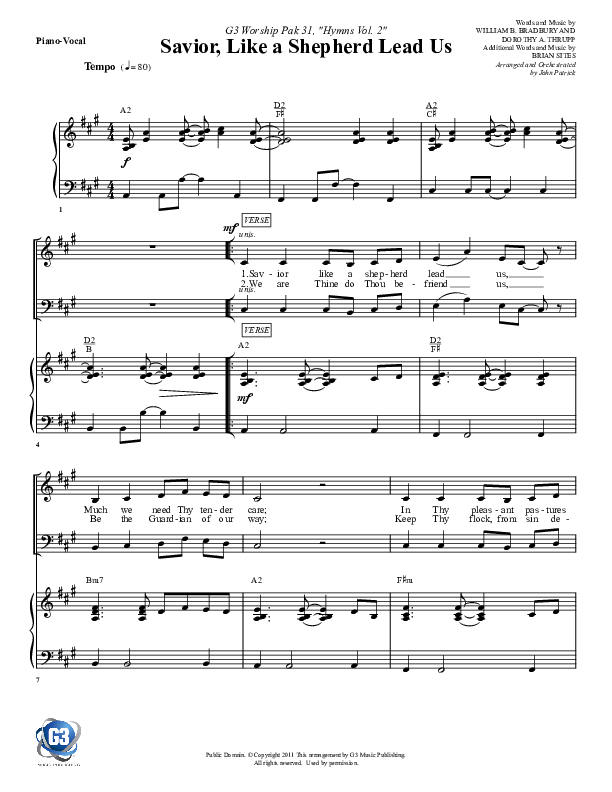 Download the sheet music for Savior Like A Shepherd Lead Us by G3 Worship, from the album Hymns Volume 2. This song was arranged by John Patrick in the key of A.