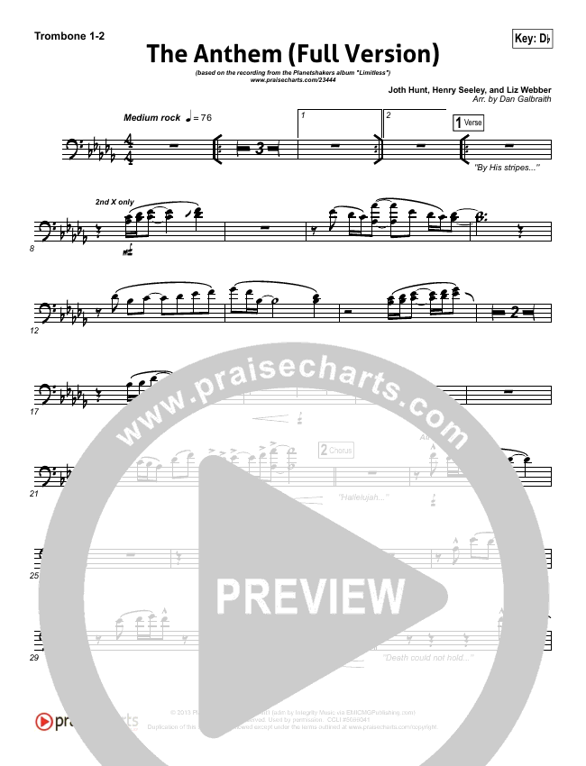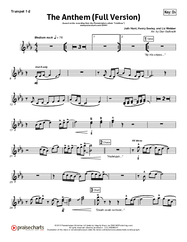 Download the Orchestration brass parts for The Anthem (Full Version) (Live) by Planetshakers, from the album Limitless. This song was arranged by Daniel Galbraith in the key of Bb, C, Db, Eb, G.