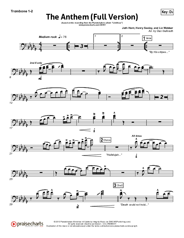 Download the Trombone 1,2 sheet music for The Anthem (Full Version) (Live) by Planetshakers, from the album Limitless. This song was arranged by Daniel Galbraith in the key of Bb, C, Db, Eb, G.