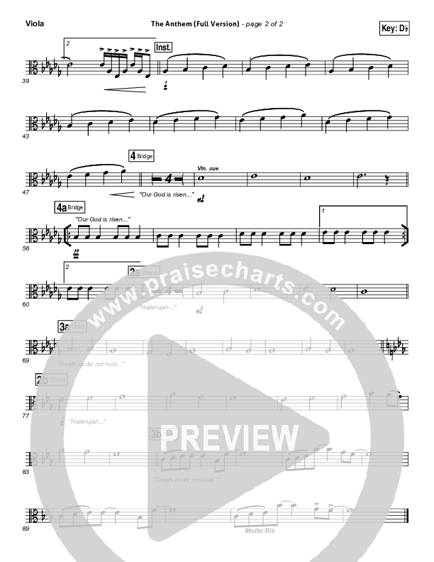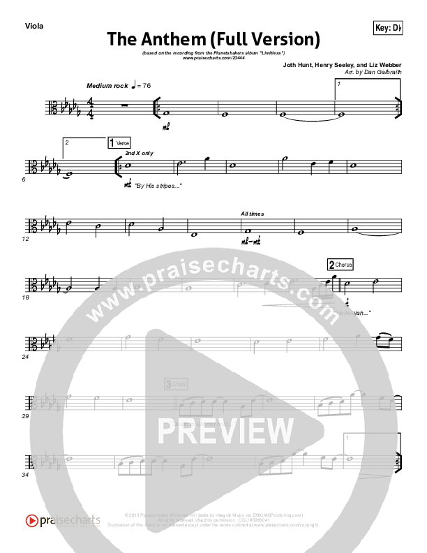 Download the Viola sheet music for The Anthem (Full Version) (Live) by Planetshakers, from the album Limitless. This song was arranged by Daniel Galbraith in the key of Bb, C, Db, Eb, G.