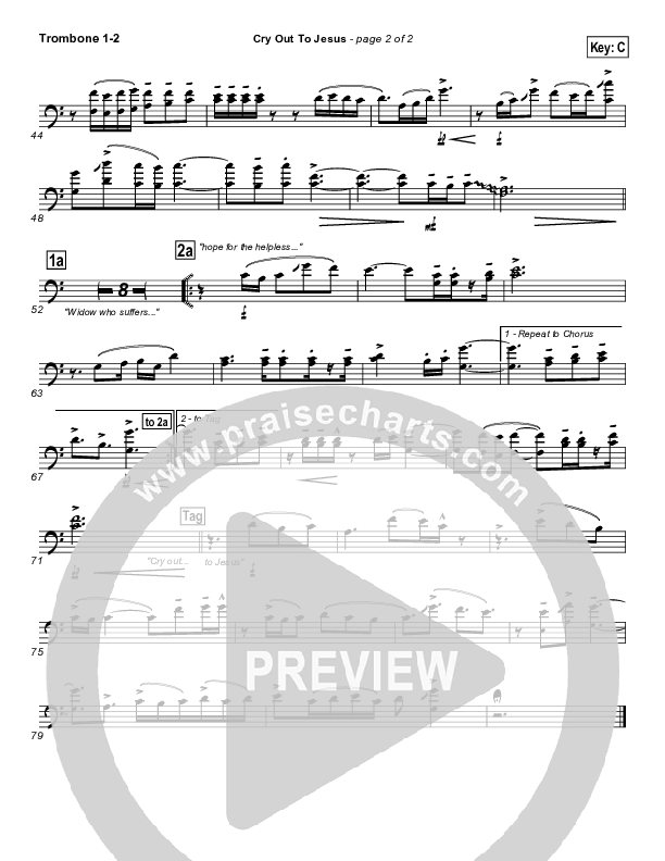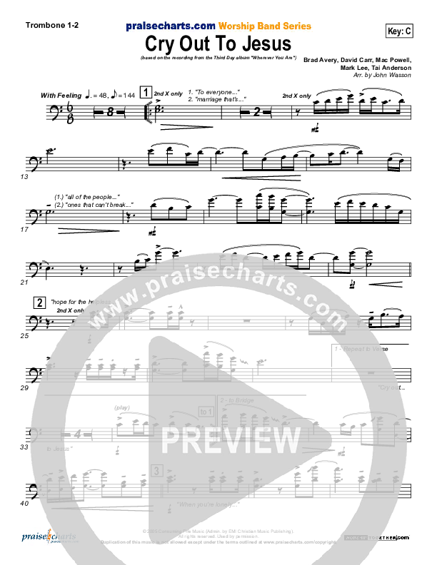 Download the Trombone 1,2 sheet music for Cry Out To Jesus by Third Day, from the album Wherever You Are. This song was arranged by John Wasson in the key of Bb, C.