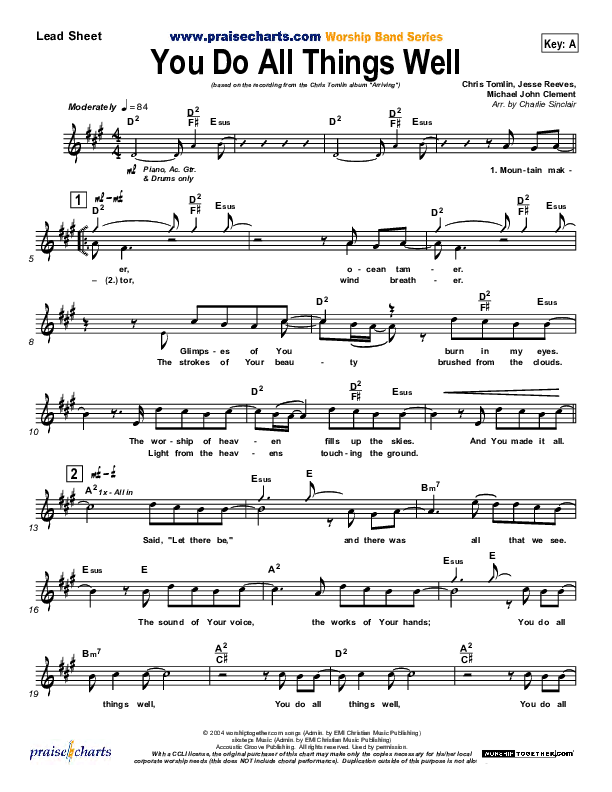 Download the Orchestration for You Do All Things Well by Chris Tomlin, from the album Arriving. This song was arranged by Charlie Sinclair in the key of A, G.