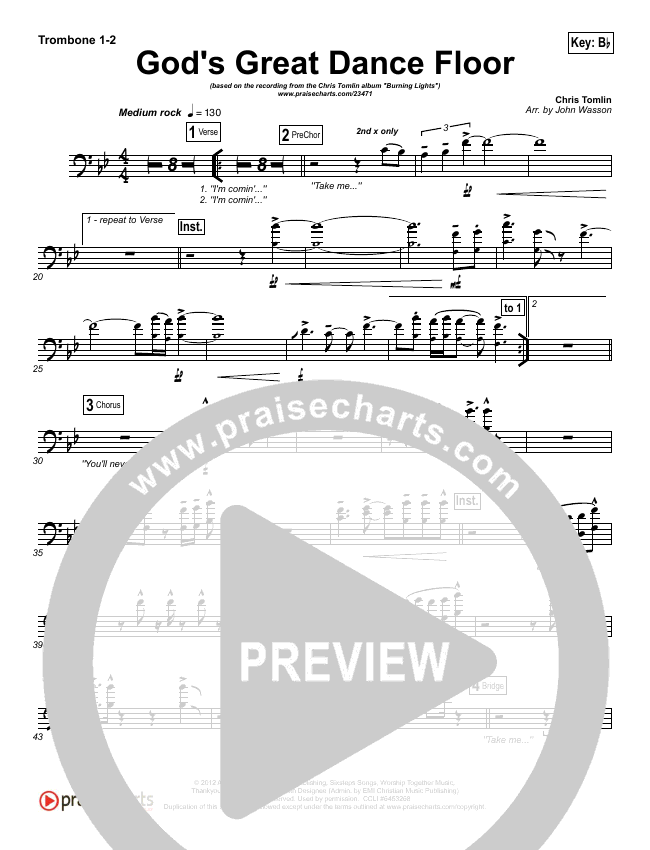 Download the Orchestration brass parts for God's Great Dance Floor by Chris Tomlin / Passion, from the album Burning Lights. This song was arranged by John Wasson in the key of A, Bb.