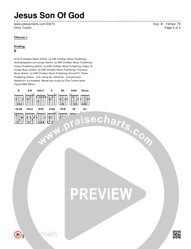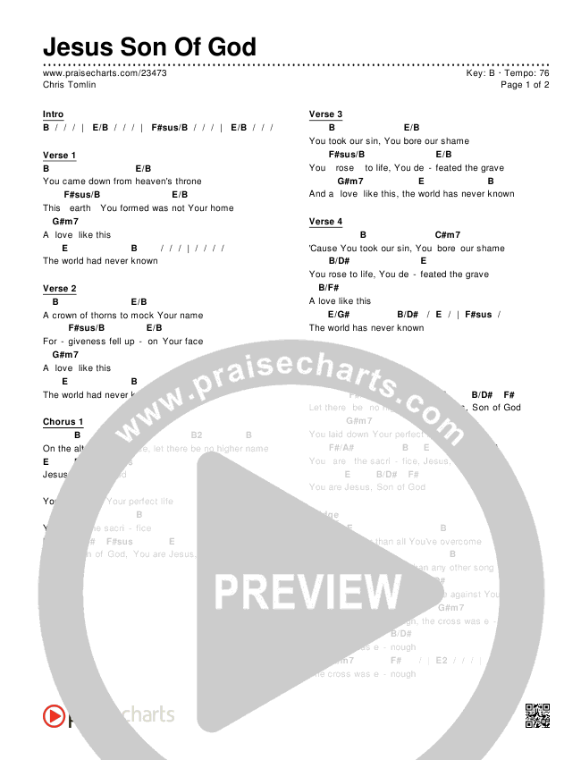 Download the PDF Chord Charts for Jesus Son Of God by Chris Tomlin, from the album Burning Lights. This song was arranged by Joel Mott in the key of B, Bb.