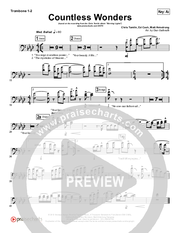 Download the Trombone 1,2 sheet music for Countless Wonders by Chris Tomlin, from the album Burning Lights. This song was arranged by Daniel Galbraith in the key of Ab, G.