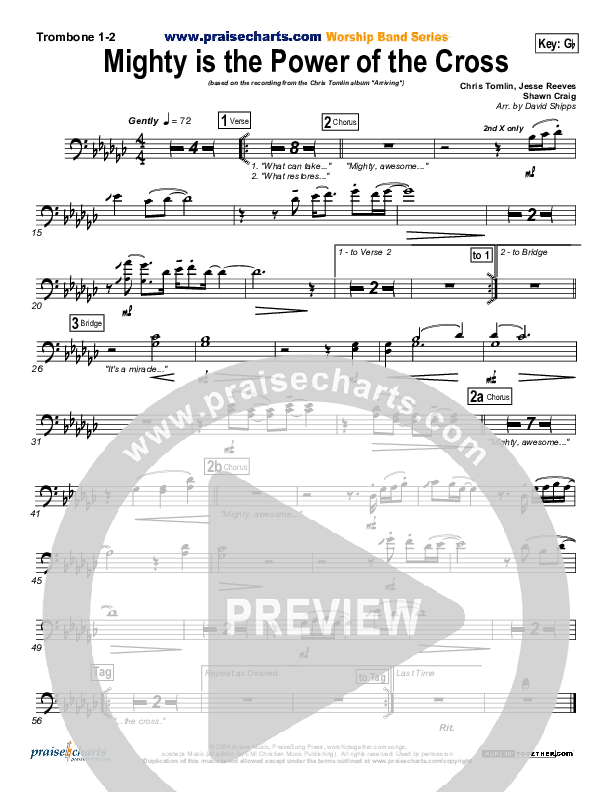 Download the Trombone 1,2 sheet music for Mighty Is The Power Of The Cross by Chris Tomlin, from the album Arriving. This song was arranged by David Shipps in the key of E, Gb.