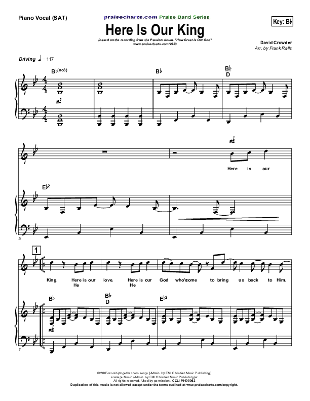Download the sheet music for Here Is Our King by David Crowder / Passion, from the album Passion: How Great Is Our God. This song was arranged by Charlie Sinclair / Frank Ralls in the key of A, Bb.