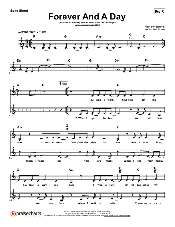 Download the sheet music for Forever And A Day by Bethel Music, from the album Be Lifted High. This song was arranged by Erik Foster in the key of C, D.