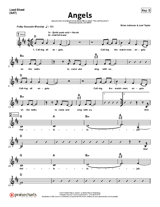 Download the sheet music for Angels by Bethel Music, from the album The Loft Sessions.