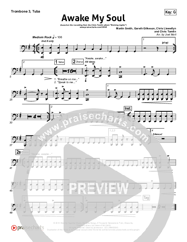 Download the Trombone 3/Tuba sheet music for Awake My Soul by Chris Tomlin, from the album Burning Lights. This song was arranged by Joel Mott in the key of F, G.