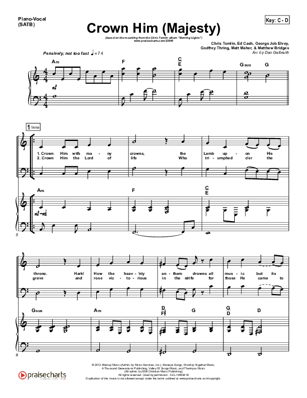 Download the sheet music for Crown Him (Majesty) by Chris Tomlin, from the album Burning Lights. This song was arranged by Daniel Galbraith in the key of A, Ab, Bb, C, Db.