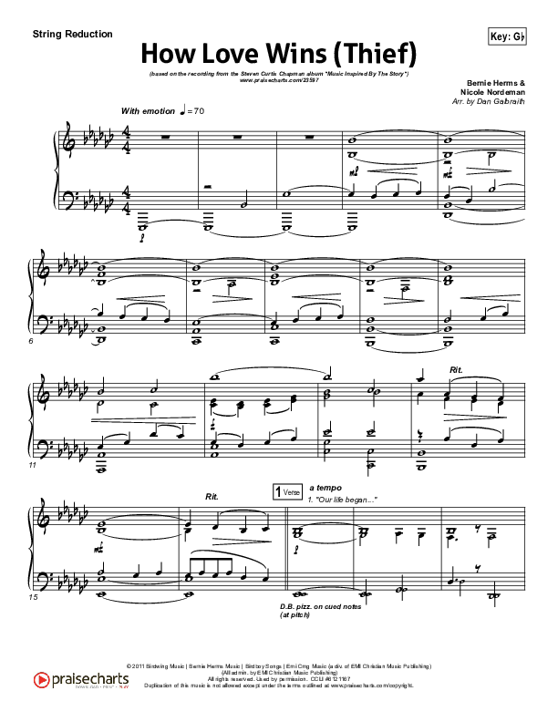 Download the Orchestration for How Love Wins (Thief) by Steven Curtis Chapman, from the album Music Inspired By The Story. This song was arranged by Daniel Galbraith in the key of E, Gb.