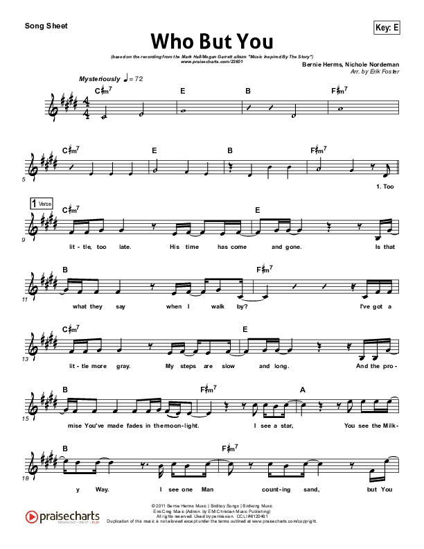 Download the Orchestration for Who But You (Abraham And Sarah) by Mark Hall / Megan Garrett, from the album Music Inspired By The Story. This song was arranged by Erik Foster in the key of Bb, E, Eb.