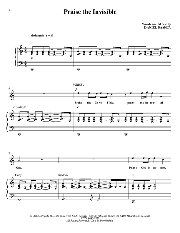 Download the sheet music for Praise The Invisible by Daniel Bashta, from the album The Invisible. This song was arranged by Integrity Music in the key of C.