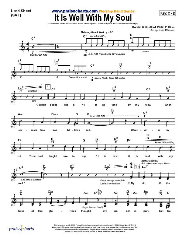 Download the sheet music for It Is Well With My Soul by PraiseCharts Band / Arr. John Wasson, from the album PraiseHymns (Vol. 1). This song was arranged by John Wasson in the key of Bb, C.