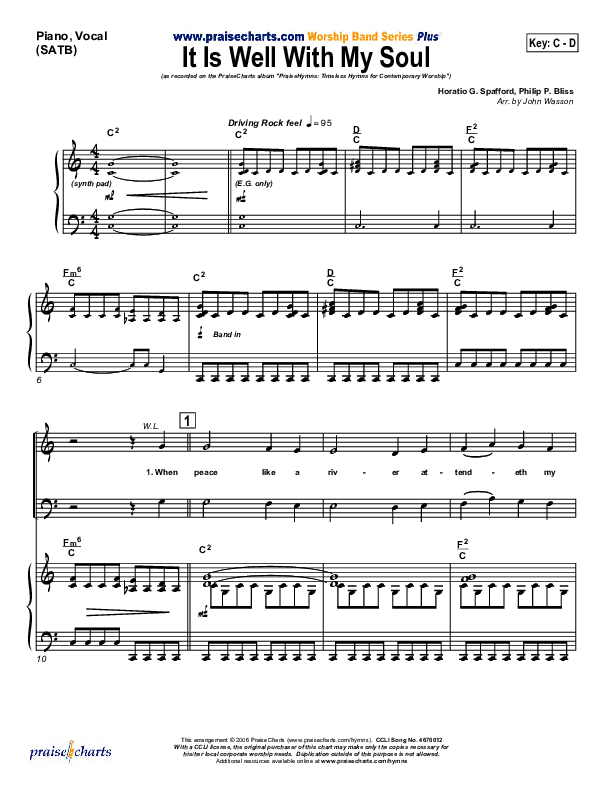 Download the sheet music for It Is Well With My Soul by PraiseCharts Band / Arr. John Wasson, from the album PraiseHymns (Vol. 1). This song was arranged by John Wasson in the key of Bb, C.