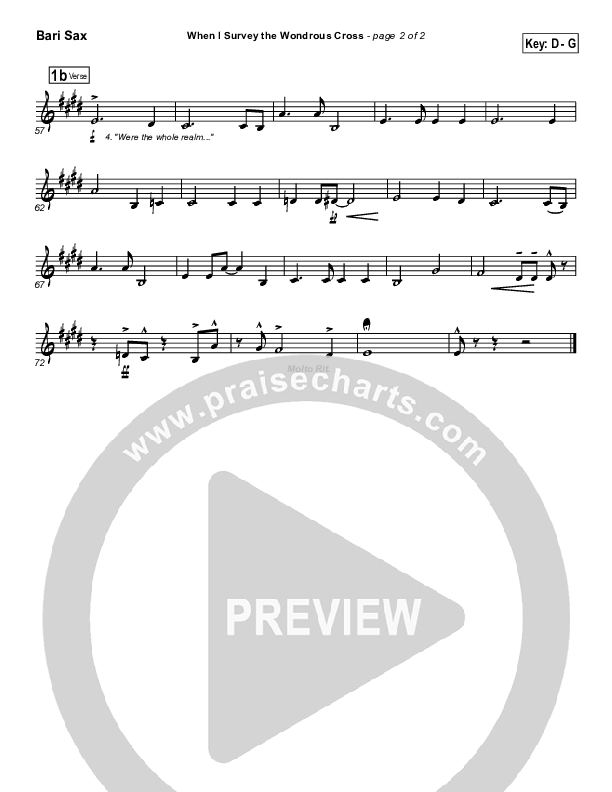Download the Bari Sax sheet music for When I Survey The Wondrous Cross by PraiseCharts Band / Kari Jobe / Arr. Daniel Galbraith, from the album PraiseHymns (Vol. 1). This song was arranged by Daniel Galbraith in the key of D, E.