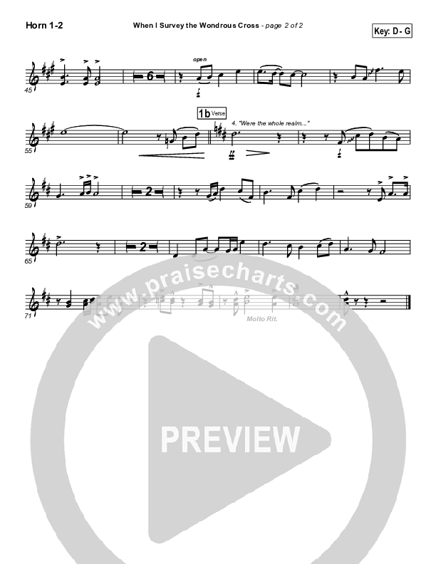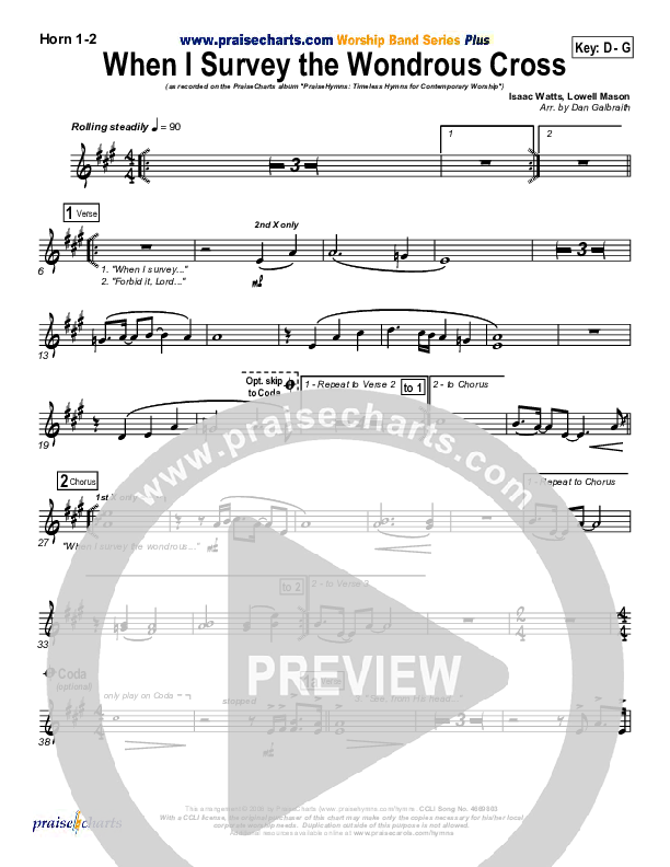 Download the Orchestration brass parts for When I Survey The Wondrous Cross by PraiseCharts Band / Kari Jobe / Arr. Daniel Galbraith, from the album PraiseHymns (Vol. 1). This song was arranged by Daniel Galbraith in the key of D, E.
