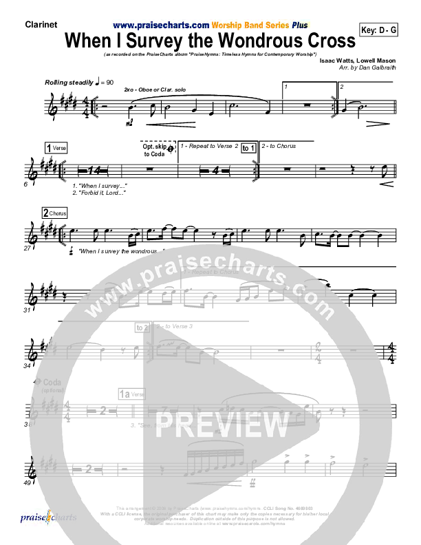 Download the Orchestration for When I Survey The Wondrous Cross by PraiseCharts Band / Kari Jobe / Arr. Daniel Galbraith, from the album PraiseHymns (Vol. 1). This song was arranged by Daniel Galbraith in the key of D, E.