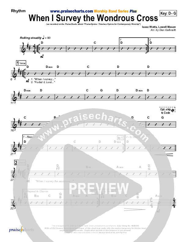 Download the Rhythm Chart for When I Survey The Wondrous Cross by PraiseCharts Band / Kari Jobe / Arr. Daniel Galbraith, from the album PraiseHymns (Vol. 1). This song was arranged by Daniel Galbraith in the key of D, E.