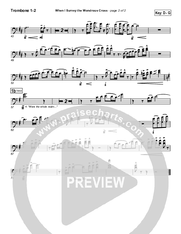 Download the Trombone 1,2 sheet music for When I Survey The Wondrous Cross by PraiseCharts Band / Kari Jobe / Arr. Daniel Galbraith, from the album PraiseHymns (Vol. 1). This song was arranged by Daniel Galbraith in the key of D, E.