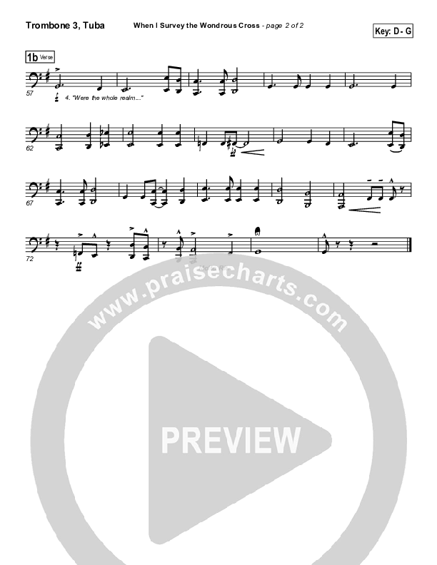 Download the Trombone 3/Tuba sheet music for When I Survey The Wondrous Cross by PraiseCharts Band / Kari Jobe / Arr. Daniel Galbraith, from the album PraiseHymns (Vol. 1). This song was arranged by Daniel Galbraith in the key of D, E.