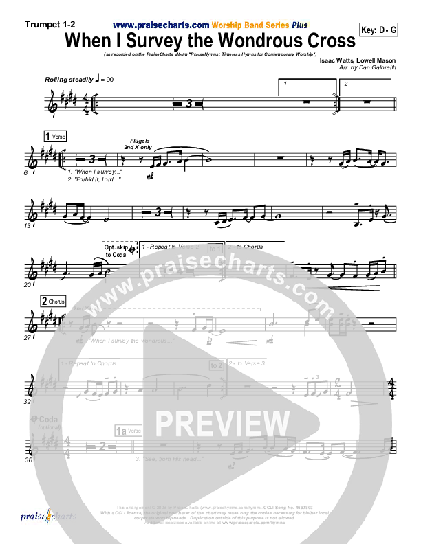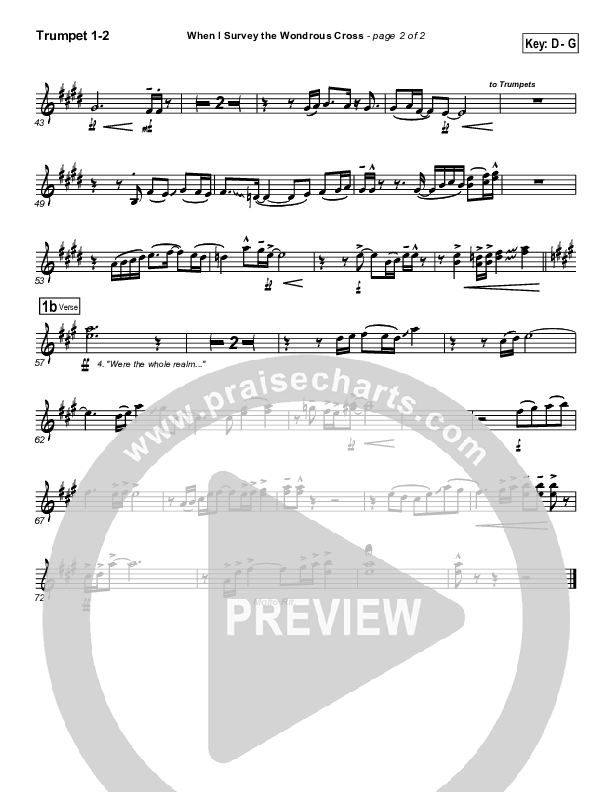 Download the trumpet sheet music for When I Survey The Wondrous Cross by PraiseCharts Band / Kari Jobe / Arr. Daniel Galbraith, from the album PraiseHymns (Vol. 1). This song was arranged by Daniel Galbraith in the key of D, E.