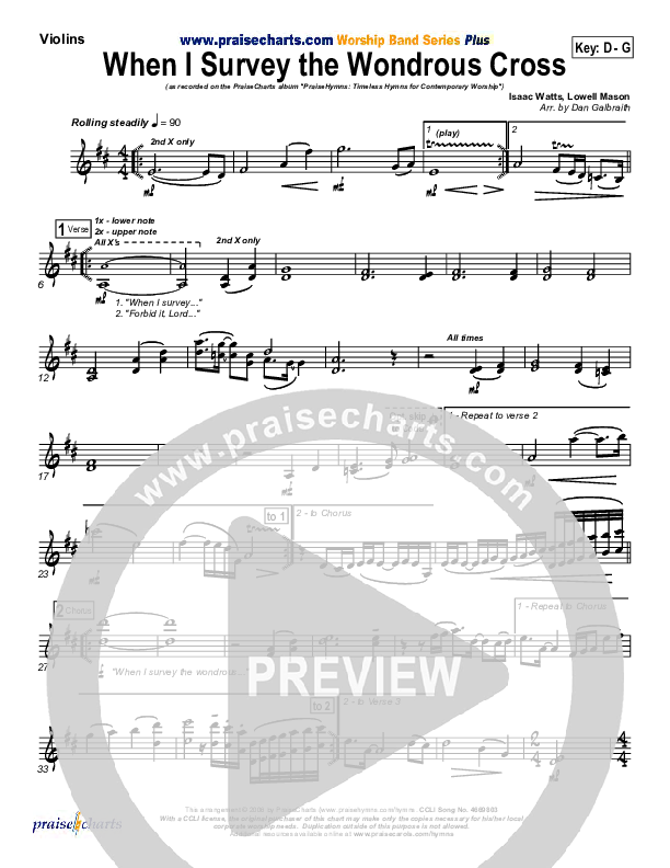 Download the Orchestration for When I Survey The Wondrous Cross by PraiseCharts Band / Kari Jobe / Arr. Daniel Galbraith, from the album PraiseHymns (Vol. 1). This song was arranged by Daniel Galbraith in the key of D, E.