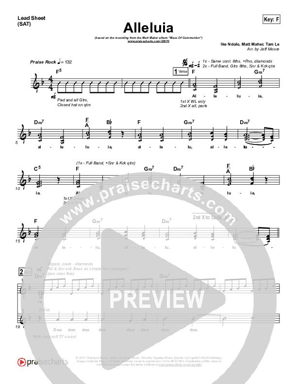 Download the sheet music for Alleluia by Matt Maher, from the album Mass Of Communion. This song was arranged by Jeff Moore in the key of E, F.