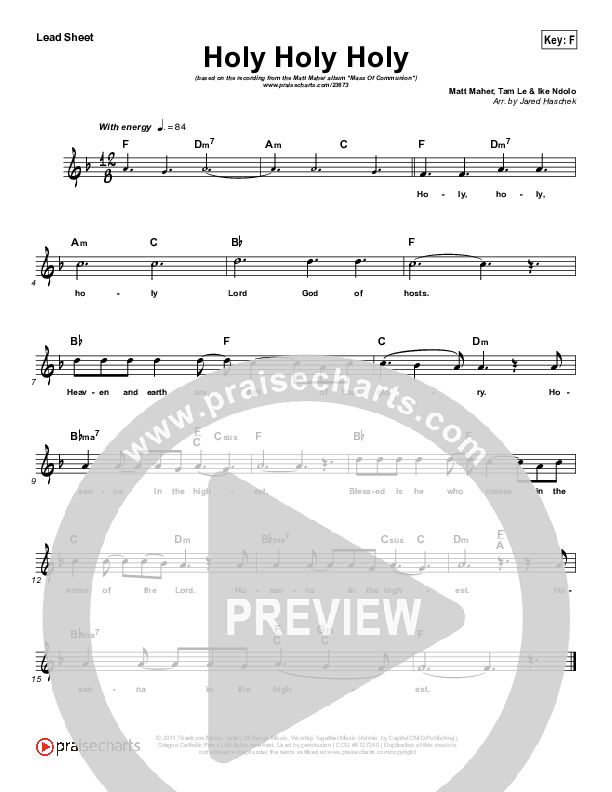Download the sheet music for Holy Holy Holy by Matt Maher, from the album Mass Of Communion. This song was arranged by Jared Haschek in the key of F.