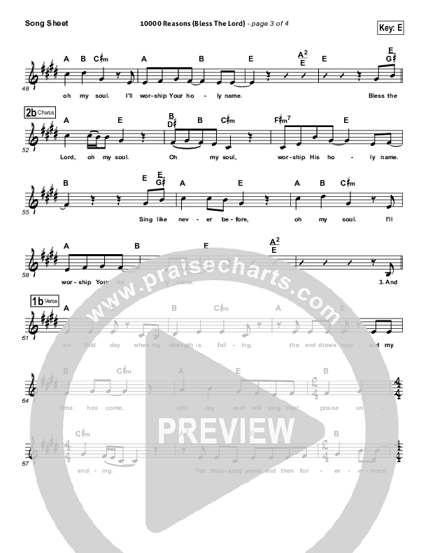 Download the sheet music for 10,000 Reasons (Bless The Lord) by Rend Collective, from the album iWorship Now Next 2013. This song was arranged by Erik Foster in the key of E, F.