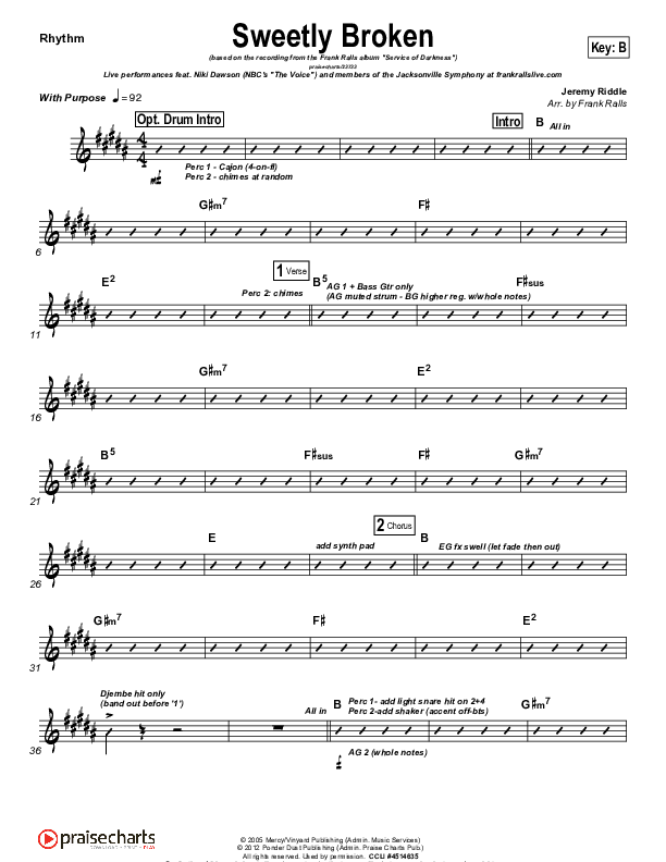 Download the Rhythm Chart for Sweetly Broken by Frank Ralls, from the album Service Of Darkness. This song was arranged by Frank Ralls in the key of B.