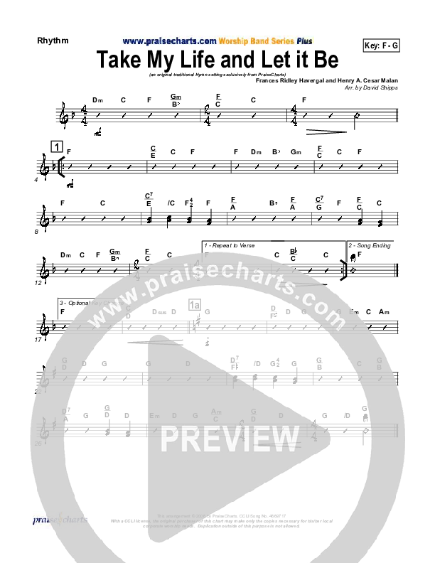 Download the Rhythm Chart for Take My Life And Let It Be by PraiseCharts / Traditional Hymn, from the album Traditional Hymns Collection. This song was arranged by David Shipps in the key of A, F.