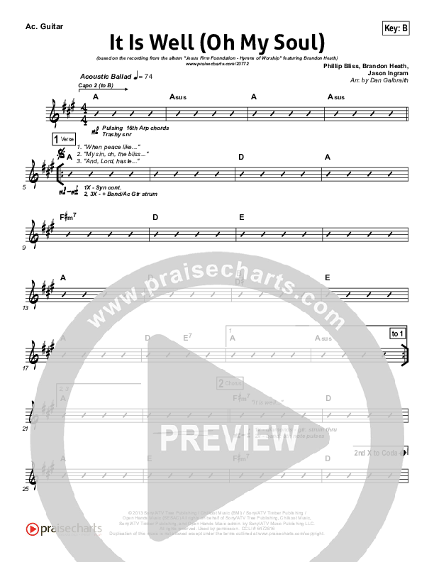 Download the Acoustic Guitar sheet music for It Is Well (Oh My Soul) by Brandon Heath, from the album Jesus Firm Foundation - Hymns of Worship. This song was arranged by Daniel Galbraith in the key of B, Bb.