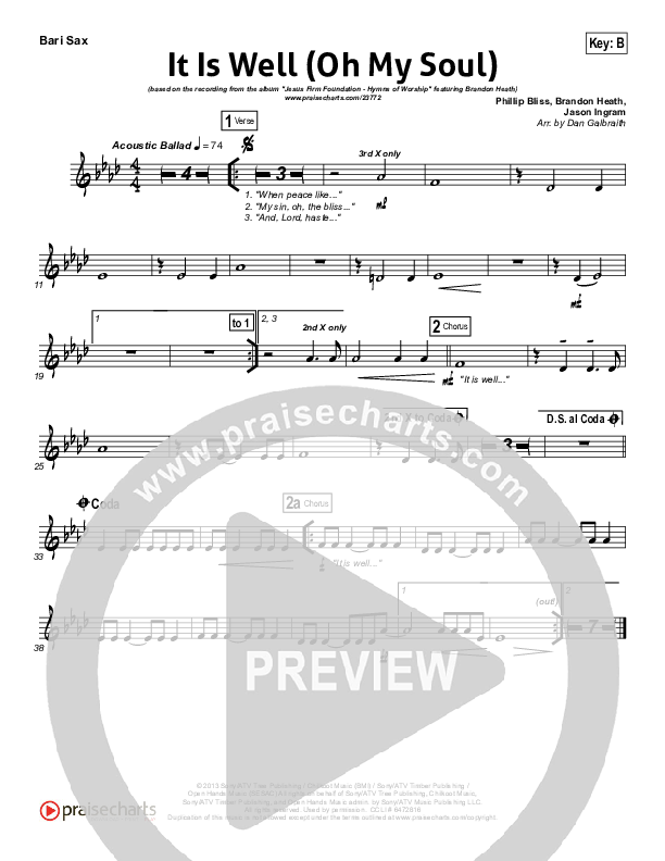 Download the Bari Sax sheet music for It Is Well (Oh My Soul) by Brandon Heath, from the album Jesus Firm Foundation - Hymns of Worship. This song was arranged by Daniel Galbraith in the key of B, Bb.