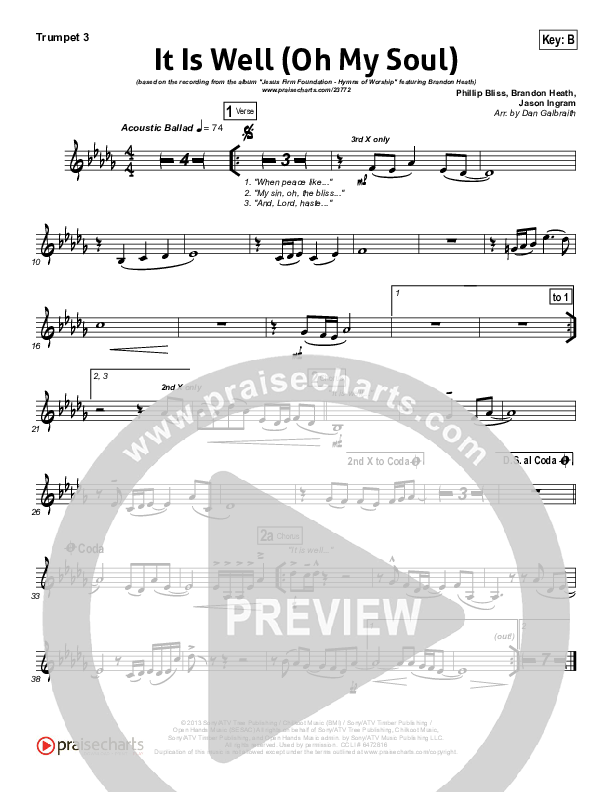 Download the Trumpet 3 sheet music for It Is Well (Oh My Soul) by Brandon Heath, from the album Jesus Firm Foundation - Hymns of Worship. This song was arranged by Daniel Galbraith in the key of B, Bb.