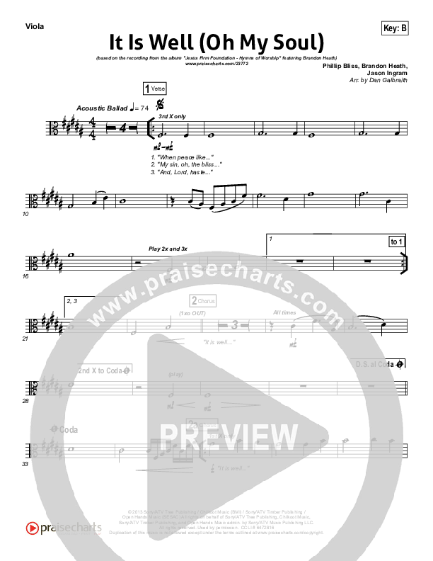 Download the Viola sheet music for It Is Well (Oh My Soul) by Brandon Heath, from the album Jesus Firm Foundation - Hymns of Worship. This song was arranged by Daniel Galbraith in the key of B, Bb.
