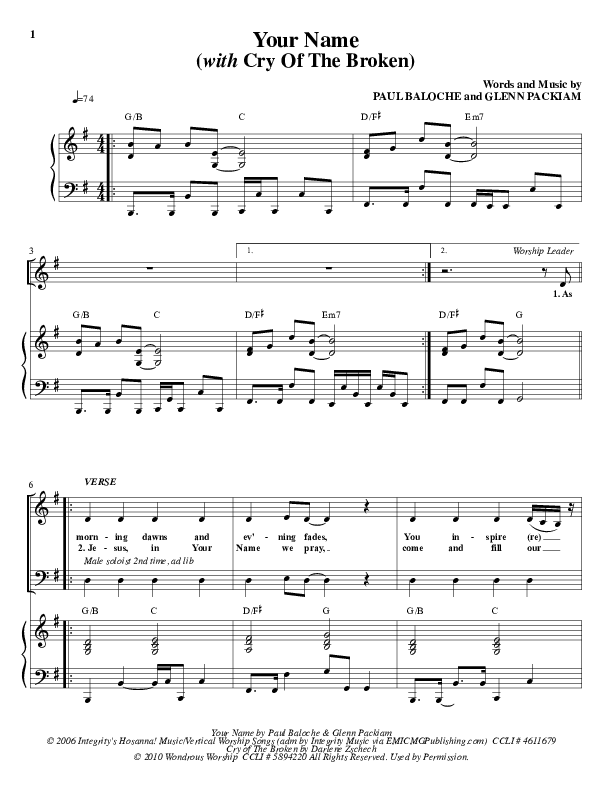 © Your Name by Paul Baloche & Glenn Packiam 2006 Integrity's Hosanna! Music/Vertical Worship Songs (Admin by Capitol CMG Publishing) Cry of The Broken by Darlene Zschech 2010 Wondrous Worship (Admin by Music Services) CCLI Song No. 4611679,5894220