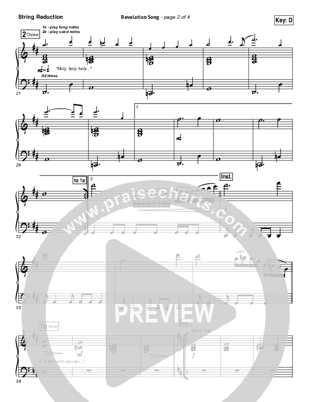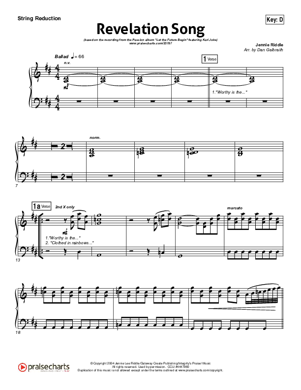 Download the Orchestration string parts for Revelation Song (Live) by Kari Jobe / Passion, from the album Let The Future Begin. This song was arranged by Daniel Galbraith in the key of D, Eb.