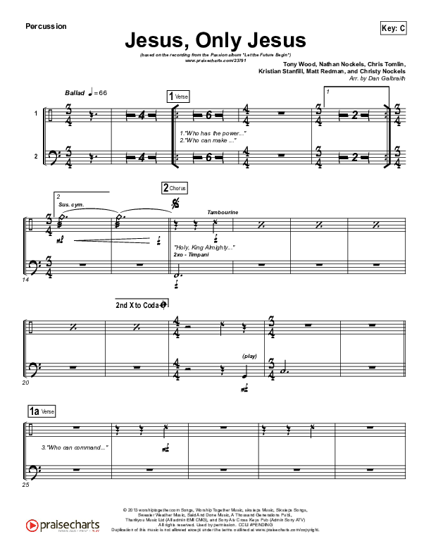 Download the percussion sheet music for Jesus Only Jesus by Matt Redman / Passion, from the album Let The Future Begin. This song was arranged by Daniel Galbraith in the key of Bb, C.