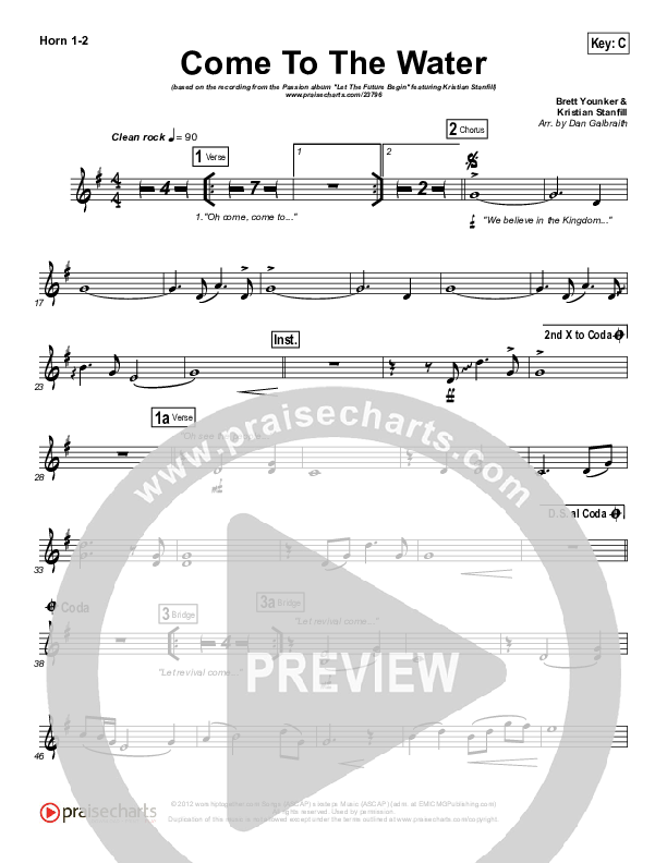 Download the French Horn sheet music for Come To The Water by Kristian Stanfill / Passion, from the album Let The Future Begin. This song was arranged by Daniel Galbraith in the key of Bb, C.