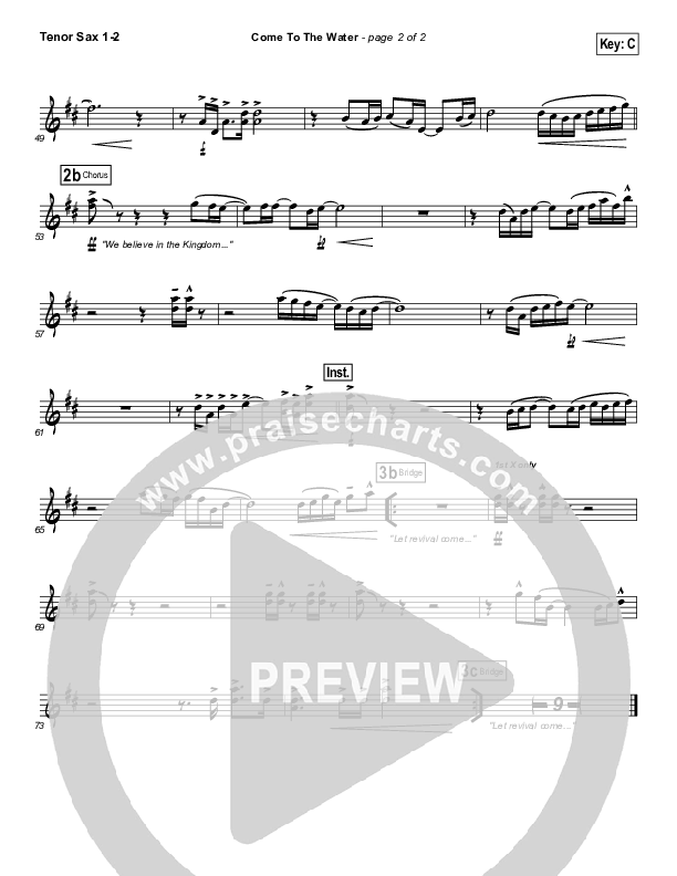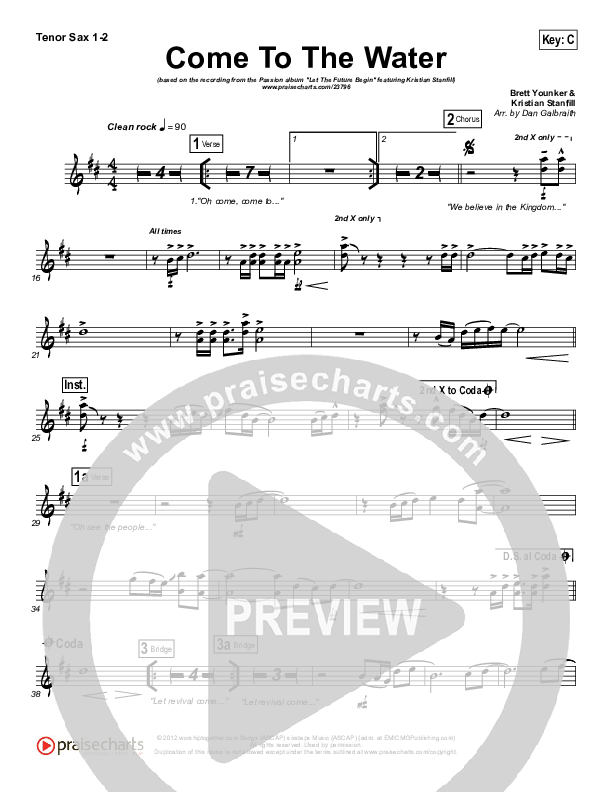 Download the Tenor Sax sheet music for Come To The Water by Kristian Stanfill / Passion, from the album Let The Future Begin. This song was arranged by Daniel Galbraith in the key of Bb, C.