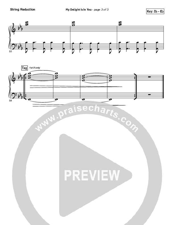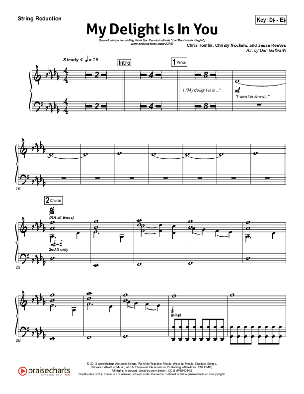 Download the Orchestration string parts for My Delight Is In You by Christy Nockels / Passion, from the album Let The Future Begin. This song was arranged by Daniel Galbraith in the key of D, Db.
