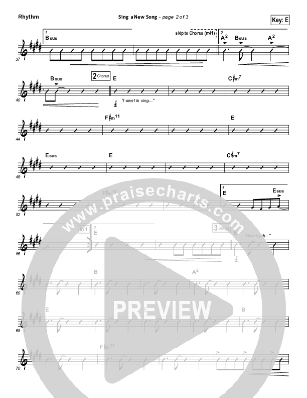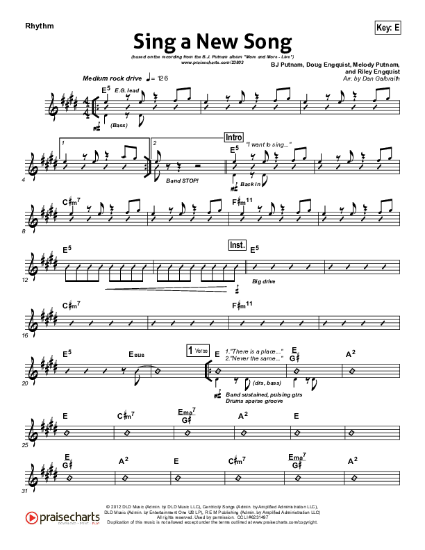 Download the Rhythm Chart for Sing A New Song by BJ Putnam, from the album More And More. This song was arranged by Daniel Galbraith in the key of D, E.