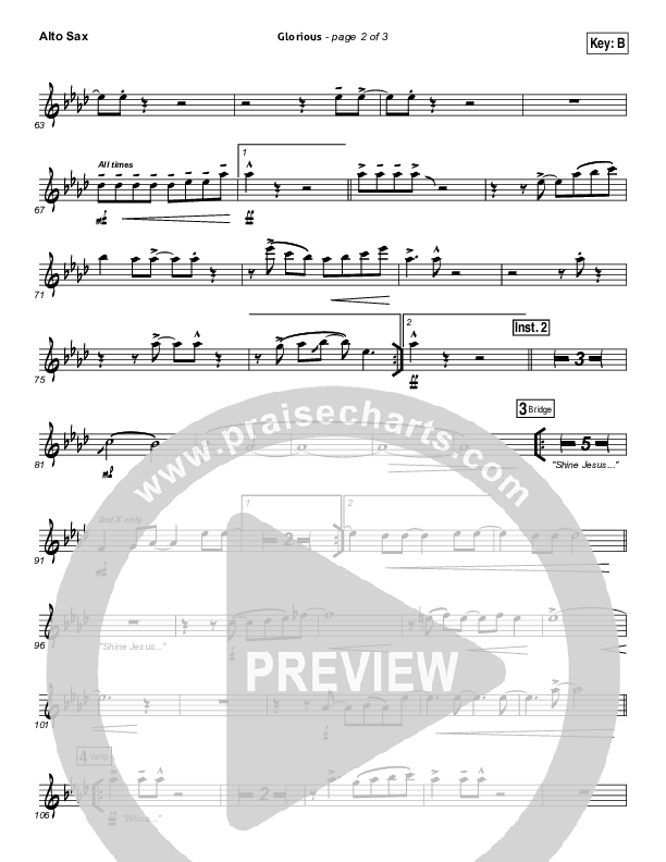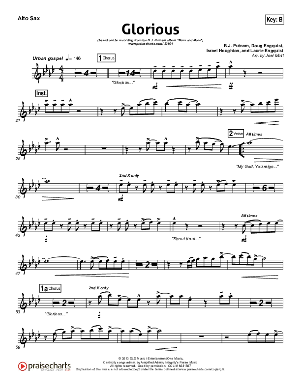 Download the AltoSax sheet music for Glorious by BJ Putnam, from the album More And More. This song was arranged by Joel Mott in the key of B, Bb.