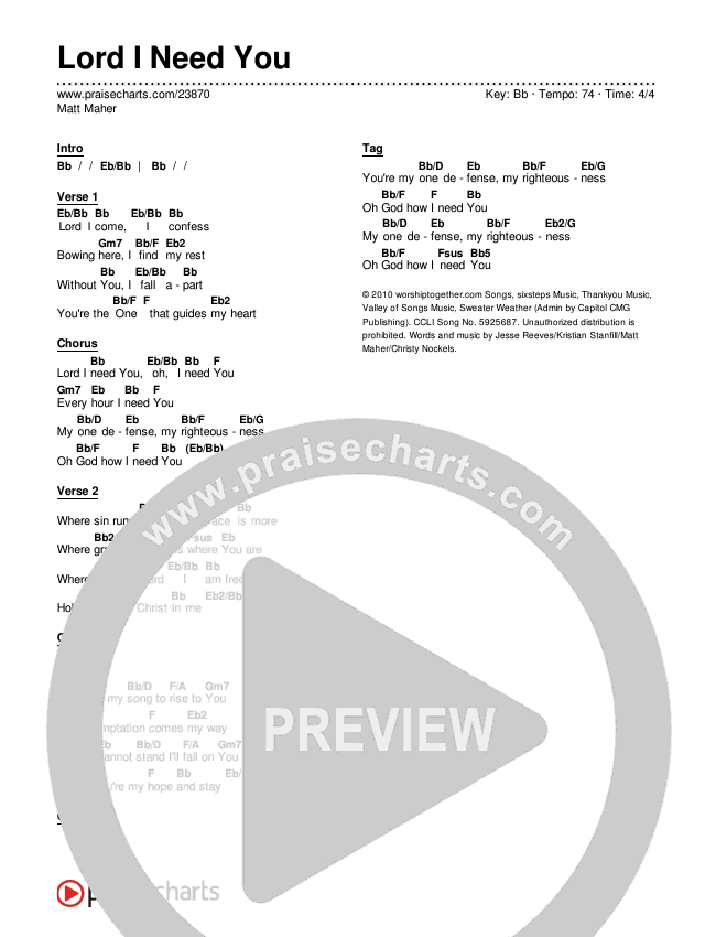 Download the PDF Chord Charts for Lord I Need You by Matt Maher, from the album All The People Said Amen. This song was arranged by Joel Mott in the key of A, Ab, B, Bb, C, G.