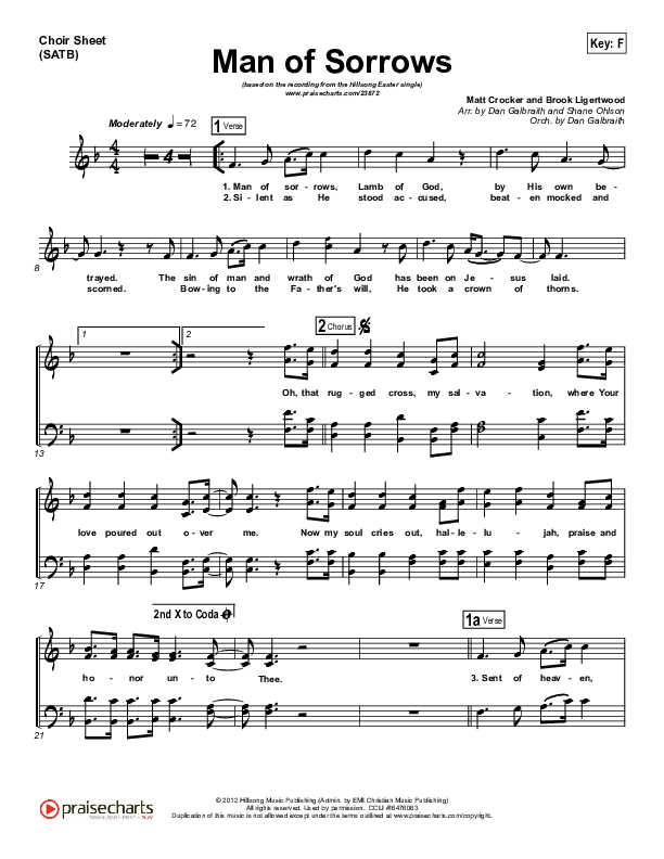 Download the Choir Sheet for Man Of Sorrows by Hillsong Worship, from the album Glorious Ruins. This song was arranged by Daniel Galbraith in the key of C, D, Db, E, Eb, F.