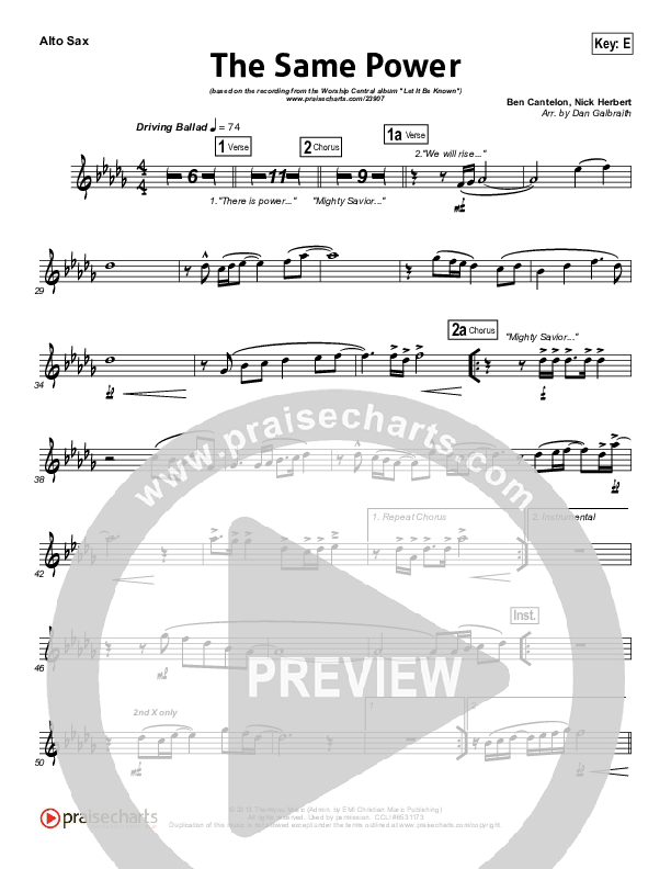 Download the AltoSax sheet music for The Same Power by Ben Cantelon / Worship Central, from the album Let It Be Known. This song was arranged by Daniel Galbraith in the key of D, Db, E.