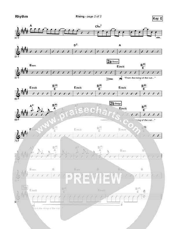 Download the Rhythm Chart for Rising by Paul Baloche, from the album A Greater Song. This song was arranged by Daniel Galbraith in the key of E, F.